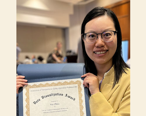 Yun Zhou, a post-doctoral traffic safety associate with North Dakota State University’s Upper Great Plains Transportation Institute (UGPTI), was awarded the 2025 Data Visualization Award at the Association of Transportation Safety Information Professionals Traffic Records Forum held in Boston July 6–9.